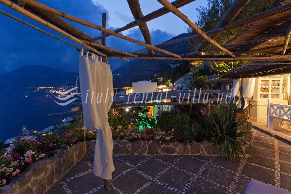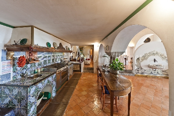 On the bottom level there is a terrace, an open kitchen equipped with dishwasher, microwave, refrigerator, gas cooker, electric oven and many other useful utensils. Furthermore there is a dining area with table for ten guests, a wide living room with brickwork fireplace, a toilet, a wellness room with sauna and fully enclosed shower as well as a laundry room with washing machine/dryer and ironing facilities. Going up a few steps you reach the first bedroom with a double and a single bed. It has access to the pool. On the first level there is the garden and a single bedroom with en-suite bathroom with shower. On the second floor there are three terraces and a large barbecue zone with a walled barbecue, a pizza oven and wooden benches. A nice place to spend pleasant evenings enjoying the magnificent view of the sea, Praiano and the coastline. Tables, chairs, deck chairs, sun umbrellas and an external shower are part of the equipment. On this floor you find two double bedroom, and a bathroom with Jacuzzi tub, too. Both bedrooms have access to a terrace. The whole house is air conditioned.